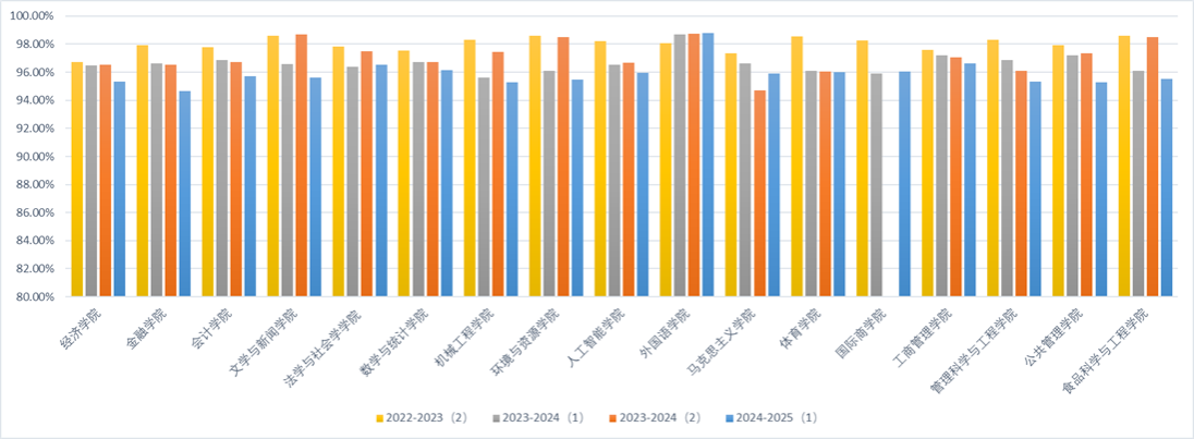 本次学生课堂出勤抽查结果分别按照“课程归属学院”和“学生归属学院”两种方式进行统计汇总(见附件1和附件2)。从按课程归属的统计结果看,外国语学院、工商管理学院、法学与社会学学院、数学与统计学院开设的课程,学生出勤率总体较高;从按学生归属的统计结果看,外国语学院、法学与社会学学院、会计学院、公共管理学院的学生,平均课堂出勤率位居前列。对比以往三学期按课程归属的统计结果,除外国语学院,全校大部分学院的出勤率略有下降(见图1)。