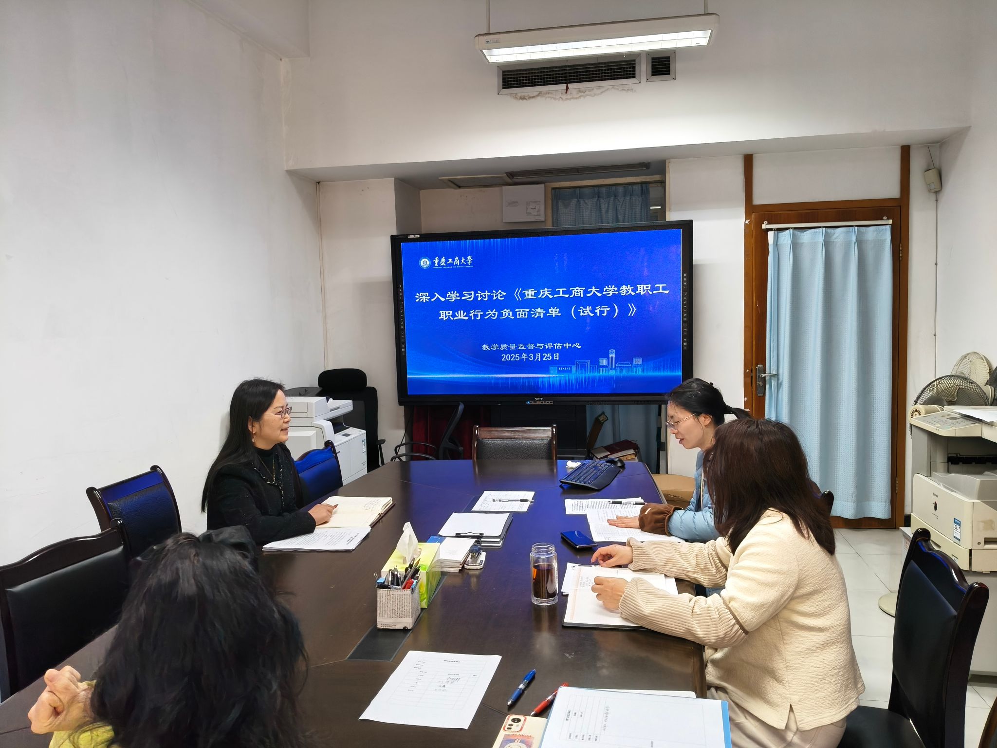 2025年3月25日上午,教学质量监督与122cc太阳集成游戏在厚德楼1013会议室组织专题会,学习教职工职业行为负面清单文件精神,部门全体教职工参加。